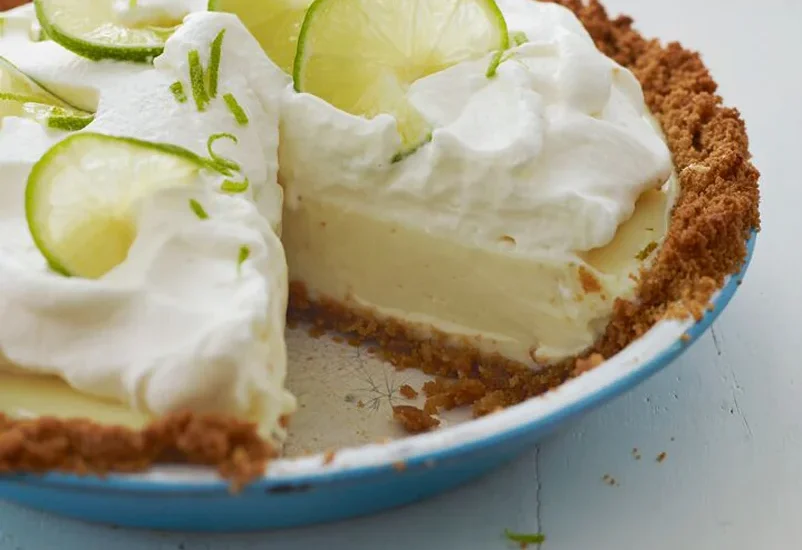 - In the bowl of an electric mixer, beat the heavy cream until soft peaks form. Add the confectioners’ sugar and beat until medium peaks form. Top the pie with the whipped cream. Decorate with the lime zest and lime slices. Store the pie in the refrigerator until ready to serve. Slice the pie into wedges, wiping your knife clean between slices, and serve cold.
