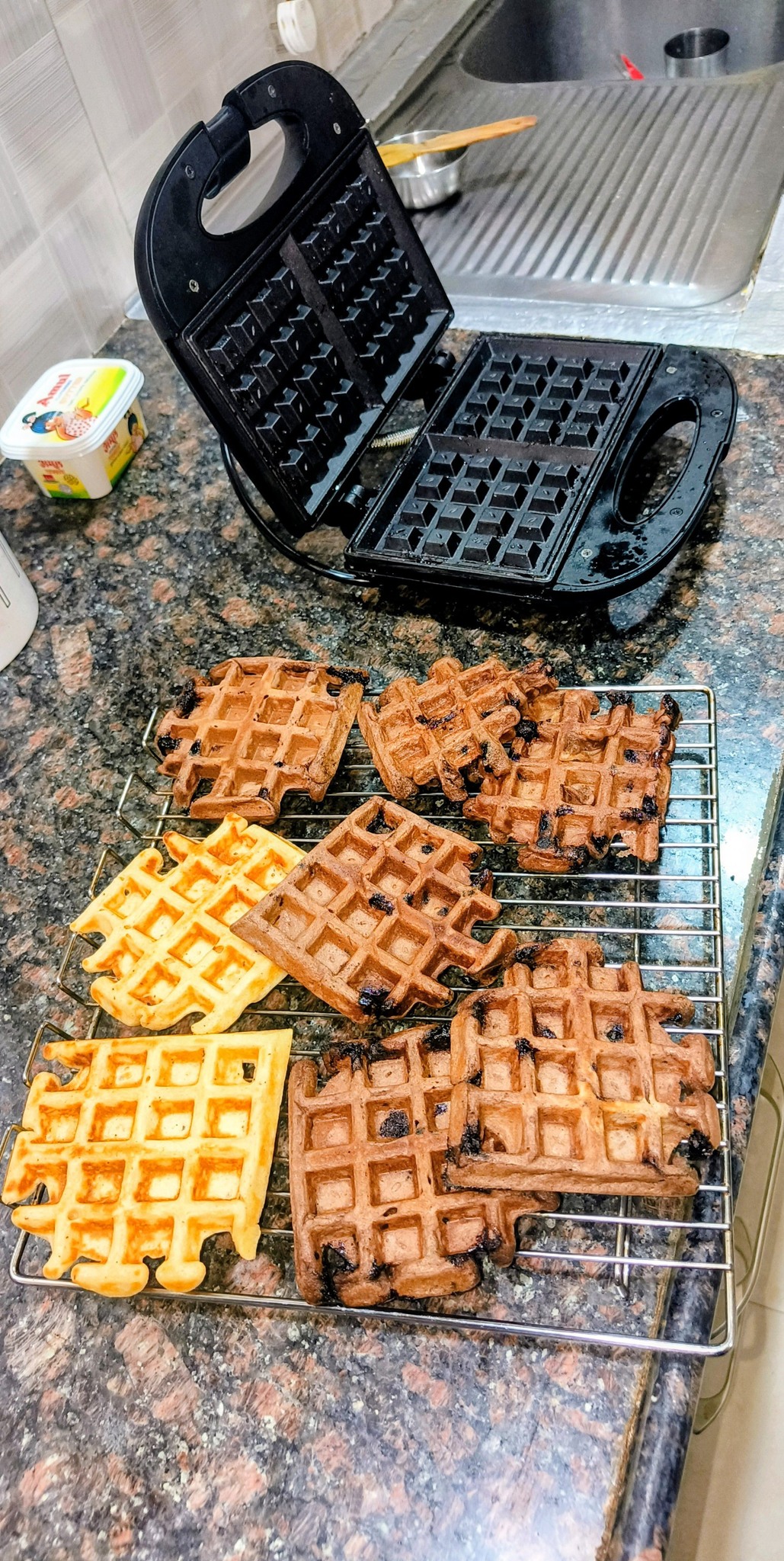 Waffle maker mein cook karo jab tak edges crispy ho jayein.