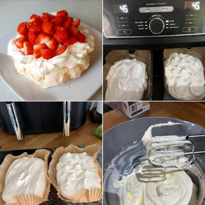 Air fryer basket mein parchment paper rakh dein. Meringue mixture ko round shape mein spread karein aur beech mein halka sa dip bana dein (topping ke liye).