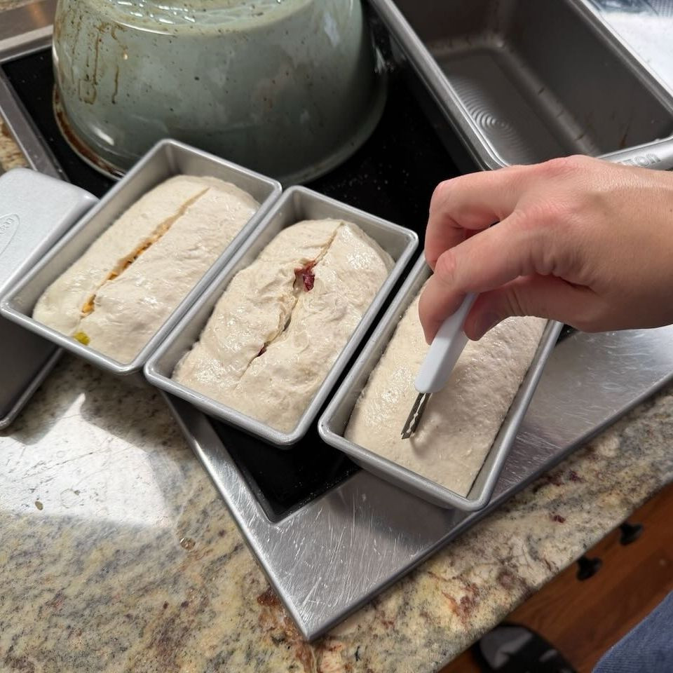 Score the top of each loaf with a sharp knife to control how the bread expands during baking.